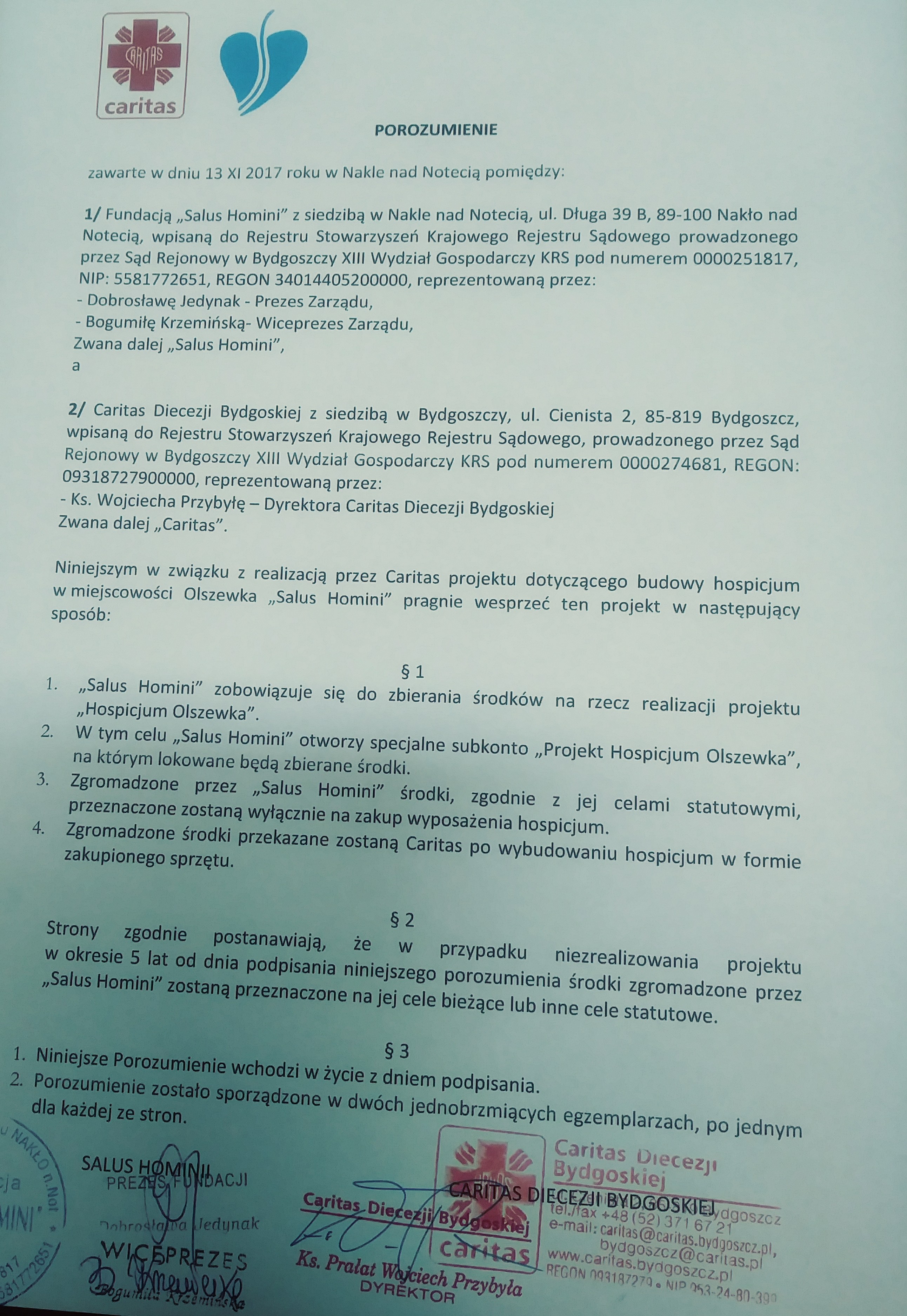 Z radością informujemy, że na mocy Porozumienia zawartego pomiędzy Caritas Diecezji Bydgoskiej a Fundacją "Salus Homini", uchwałą Zarządu, otworzyliśmy subkonto na rzecz projektu "Hospicjum- Olszewka" realizowanego przez Caritas. Zgromadzone na nim środki finansowe ( tj. 40% wpływu z każdej zbiórki i akcji charytatywnej) zostaną przekazane na zakup sprzętu do powstającego hospicjum. Reszta środków, jak dotychczas przeznaczana będzie na wsparcie podopiecznych Hospicjum Domowego NZOZ Medicus i ich rodzin, oraz pozostałe cele statutowe Fundacji "Salus Homini". Poniżej zamieszczamy odpowiednie numery kont bankowych: